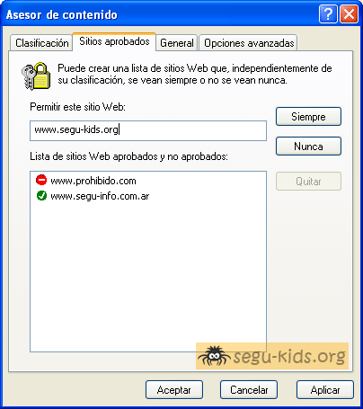 - Haz clic en el botón Siempre para agregar el sitio a la lista de sitios Web aprobados. O bien puedes hacer clic en el botón Nunca para restringir el acceso al mismo.